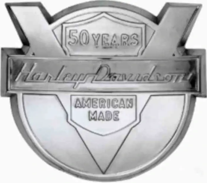 En 1953, y para conmemorar el 50 aniversario se rediseñó el logotipo para rendir homenaje al famoso motor V-Twin. Así sobre un logotipo circular, la letra 'V' era prominente y sobresaliendo del círculo, con los textos '50 años' en la parte superior y 'hecho americano' en la parte inferior, con el nombre de la marca en el centro.